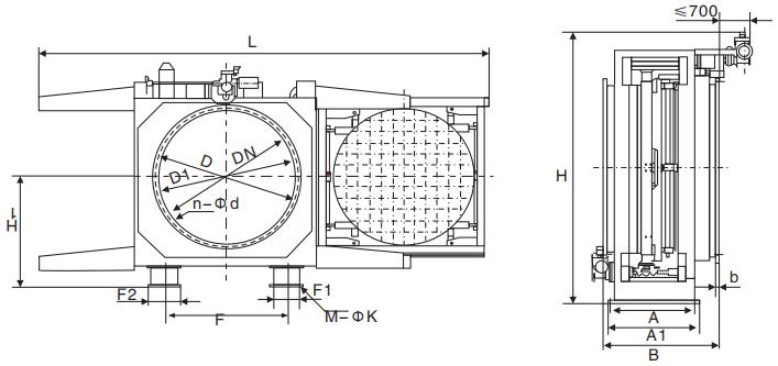 | dn | d | d1 | b | b | n-d | h | h1 | l | a | a1 | f | f1 | f2 | m-k | 电动功率(kw) | 质量(kg) | ||||