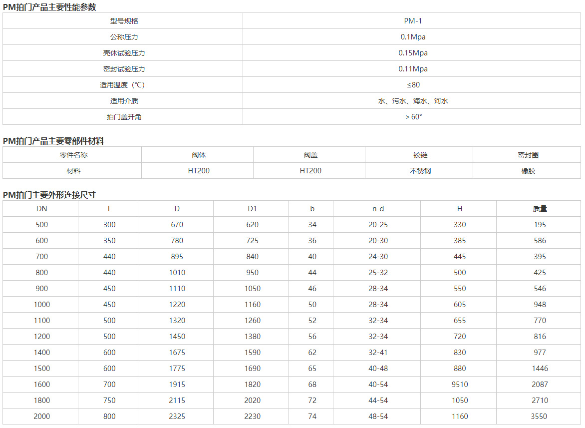 沃茈阀门(上海)有限公司生产销售的PM拍门(止回阀),多用于给水排水和污水处理工程的各种管道和水渠道。用以溢流或止回介质。也可用作各种竖井盖。 PM拍门特点该项拍门系由体,盖及铰链构件组成。其启闭力来自水源压力,不需要人工操作。该拍门内的水压大于拍门外侧压,则开启;反之则关闭,以达到溢流和止回的作用。