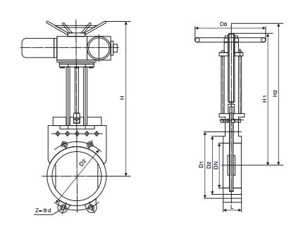 二、PZ573X伞齿轮浆液阀/伞齿轮刀闸阀主要外形及连接尺寸