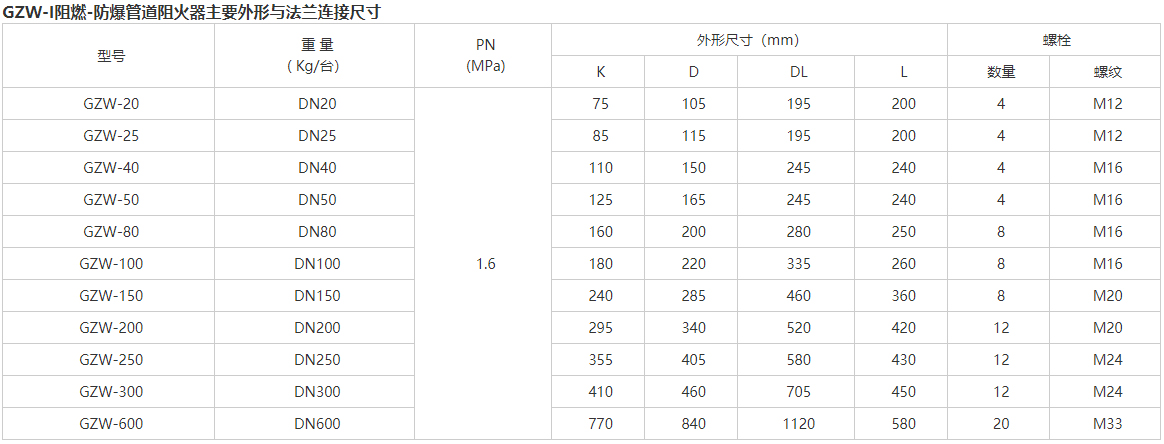 沃茈阀门(上海)有限公司生产销售的GZW-I,GYW-I型阻燃-防爆管道阻火器,采用专用阻火网以3至13片网组合结构。可防止13次以亚音速火焰通过。有效保证管路系统的安全。广泛用于:石化、锅炉、气体净化、煤矿瓦斯排放等场合上使用。为满足不同工况使用要求,我们公司制作本产品分为法兰管路常用型和焊接高压管路专用型两种。主体可采用铸钢或不锈钢304、316l材质制造。具有结构合理,重量轻,耐腐蚀,使用安全可靠地,阻爆性能合格等特点。