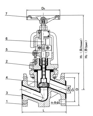 1, valve body, 2, valve cover 3, valve body 4, valve flap 5, pressure cover 6, valve stem 7, handle