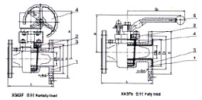 1、阀体、2、阀盖3、塞子4、蜗轮装置1、阀体、2、阀盖3、阀体衬里4、塞子5、手柄