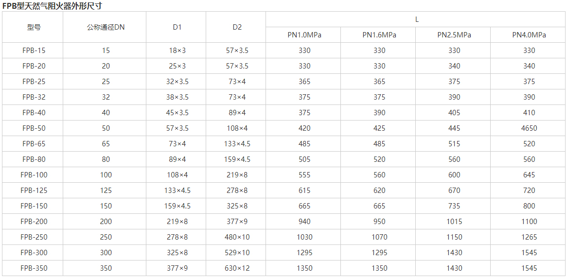 FPB天然气阻火器参数及范围